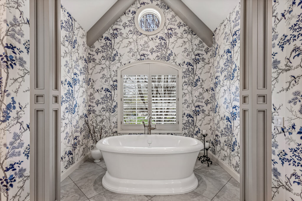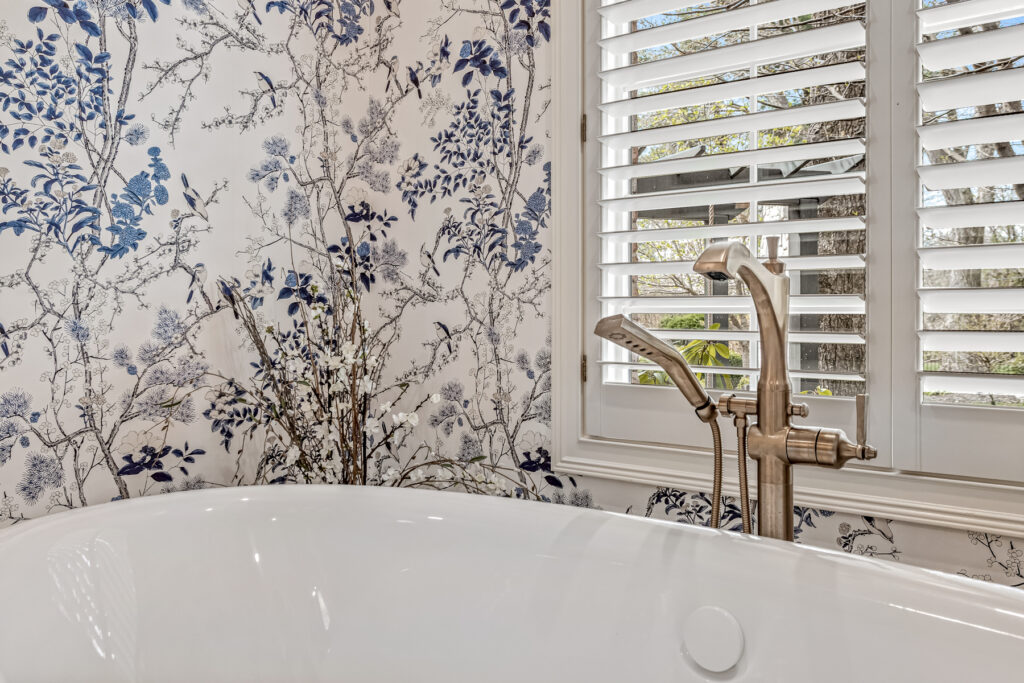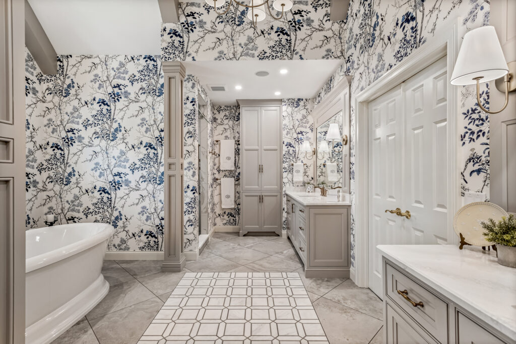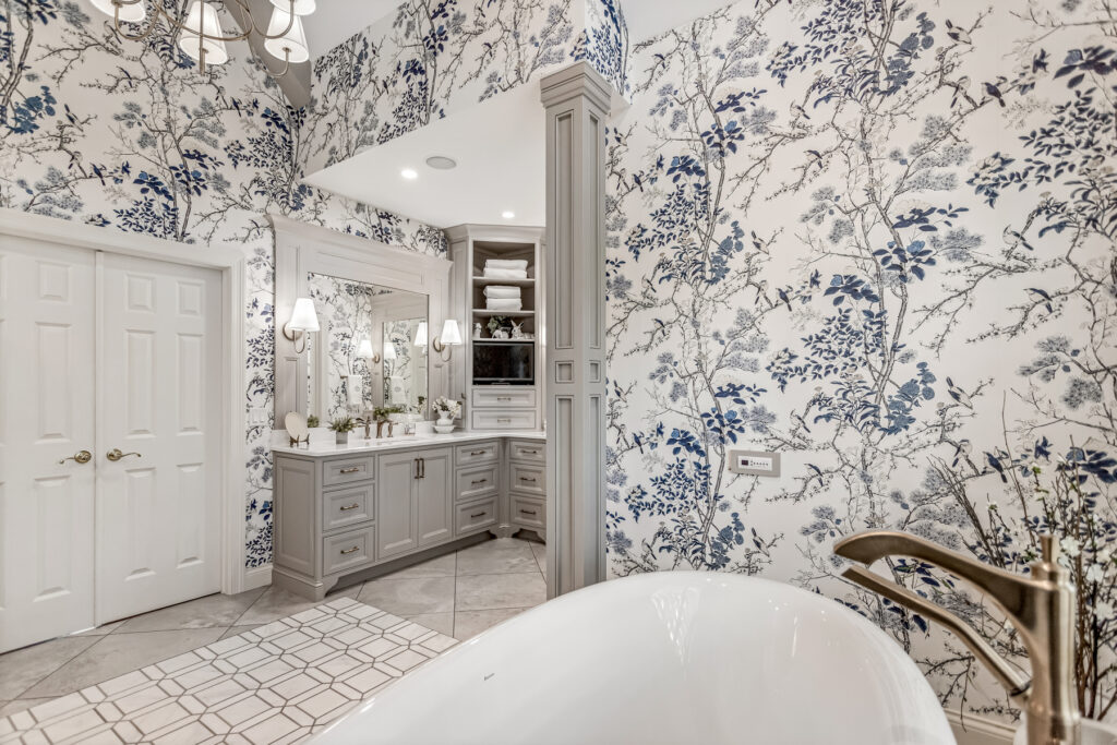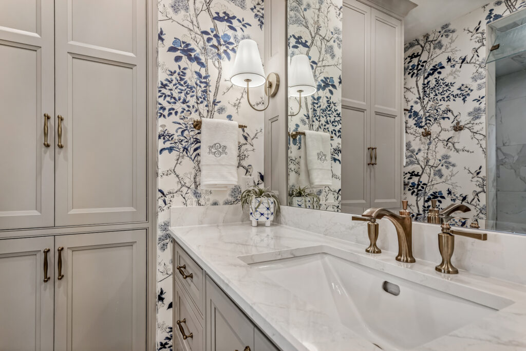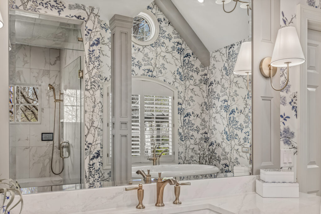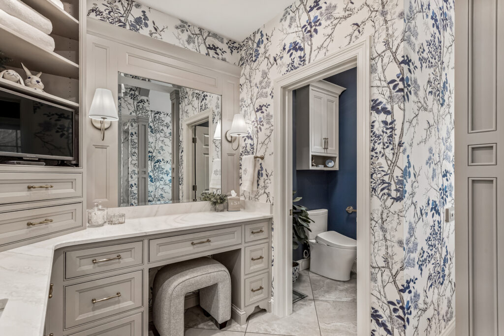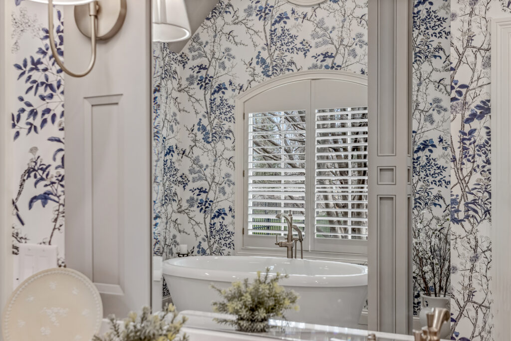 One of the most striking design element is the wallpaper—a delicate blue-and-white botanical pattern. It wraps the entire space, transforming the room into an immersive, garden-like environment. The cool blue tones contrast gently with the crisp white trim and soft gold fixtures, keeping the space fresh rather than busy.