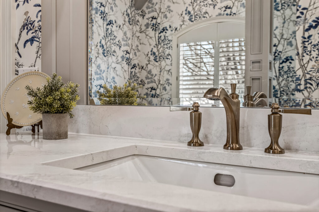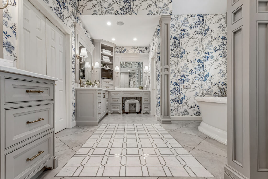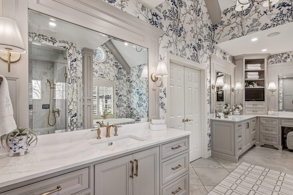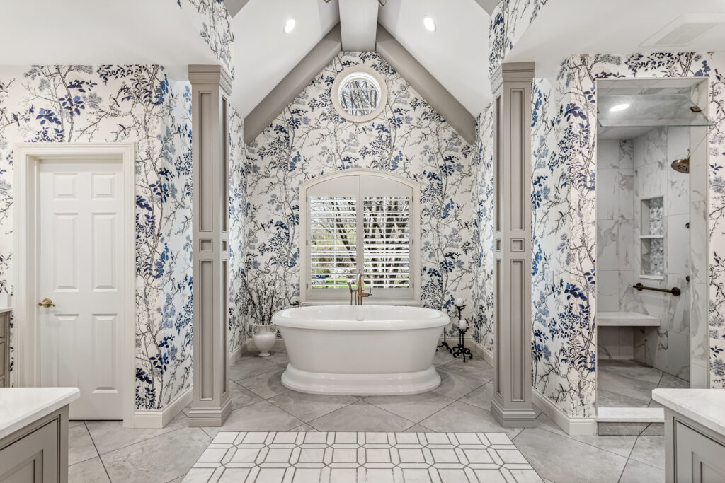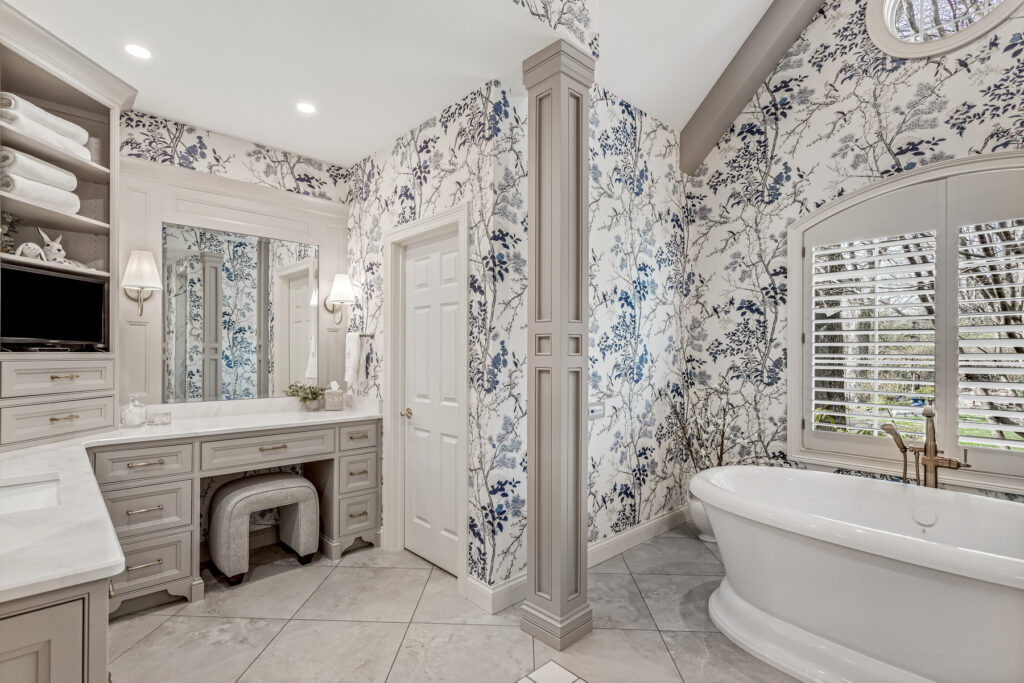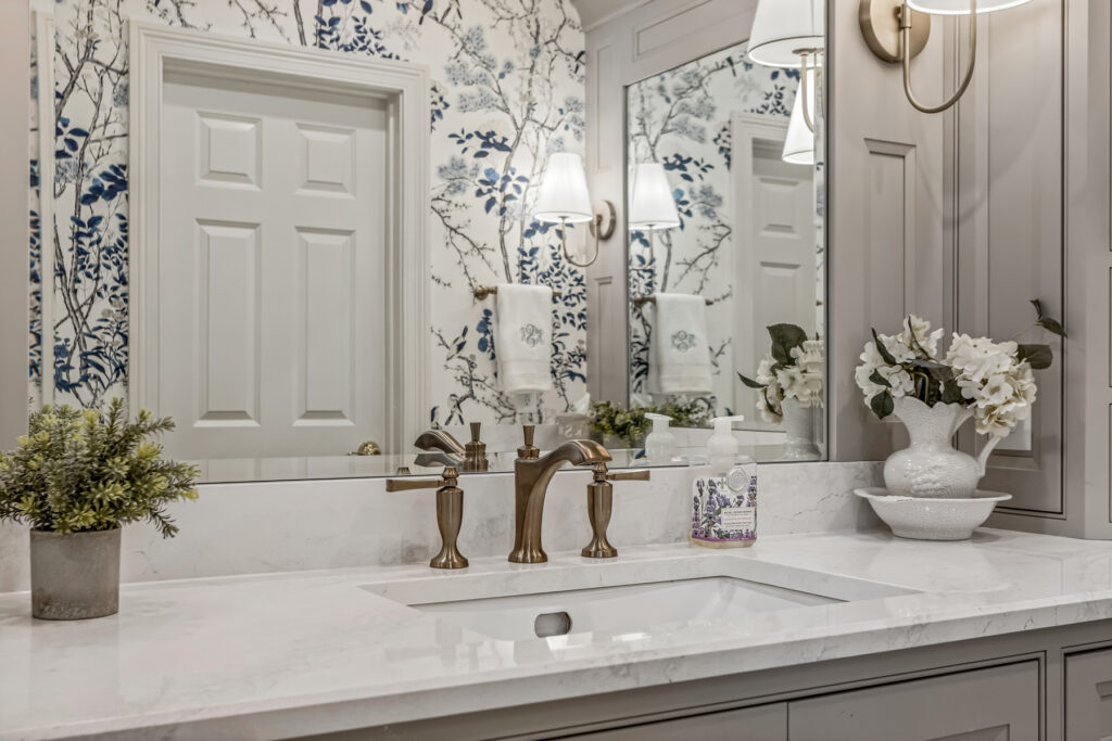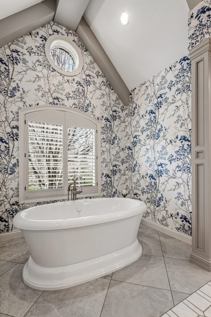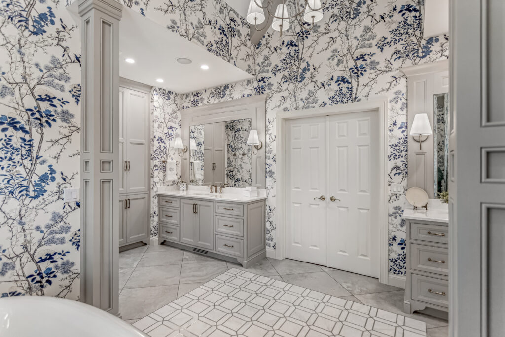 One of the most striking design element is the wallpaper—a delicate blue-and-white botanical pattern. It wraps the entire space, transforming the room into an immersive, garden-like environment. The cool blue tones contrast gently with the crisp white trim and soft gold fixtures, keeping the space fresh rather than busy.