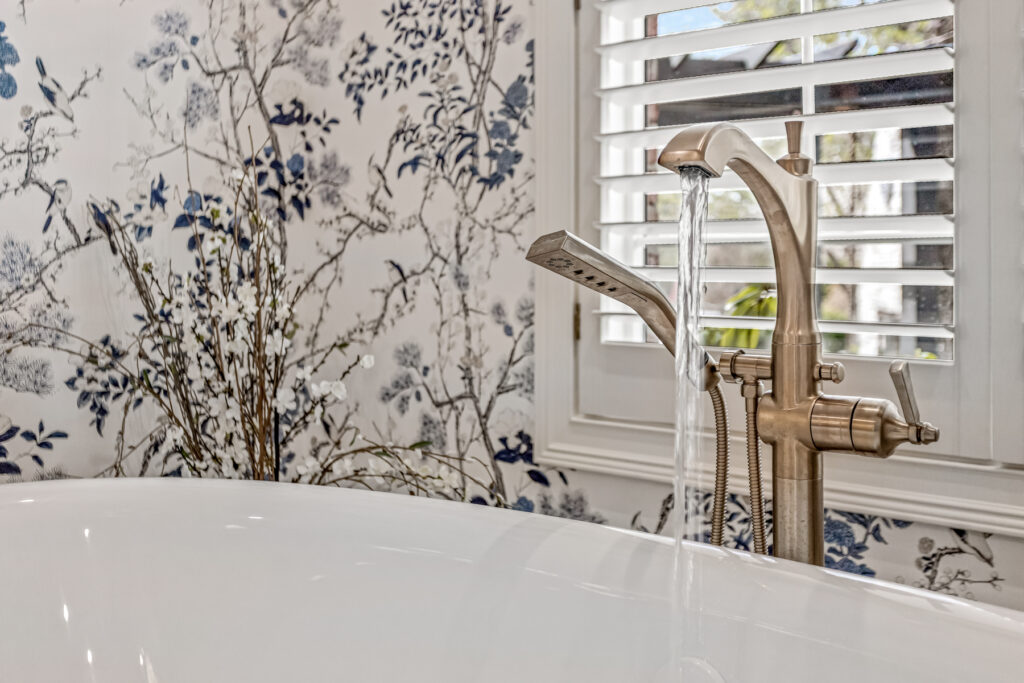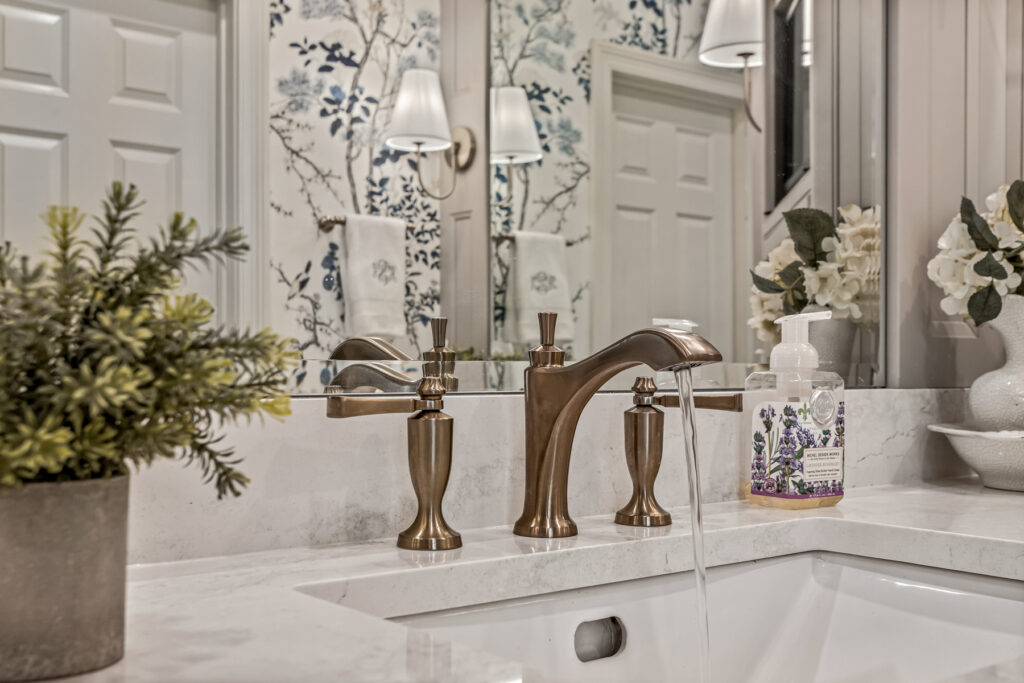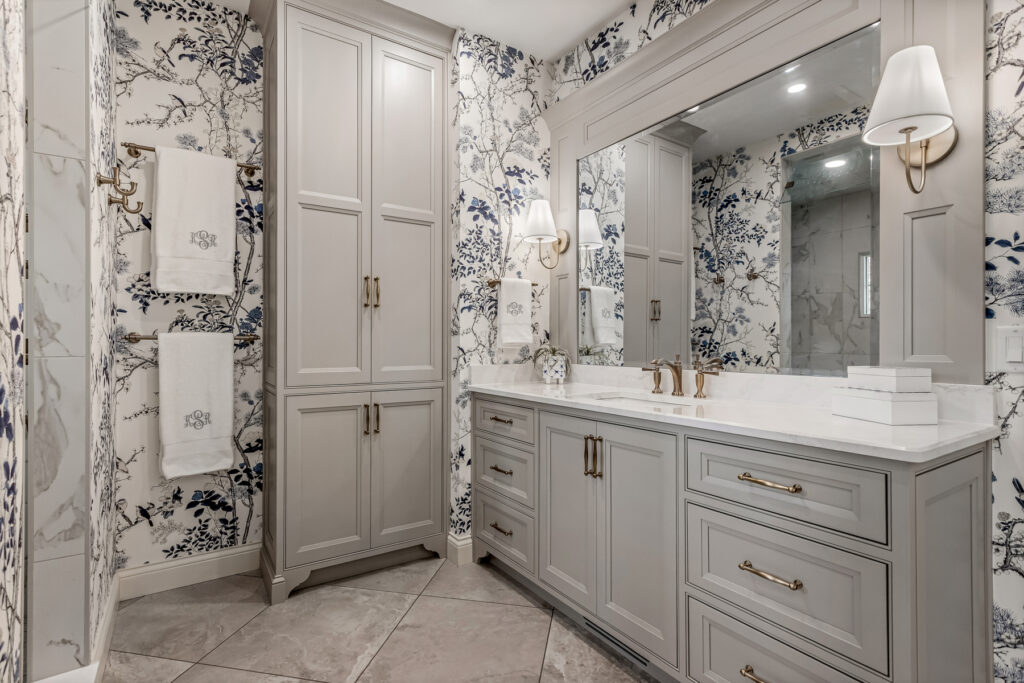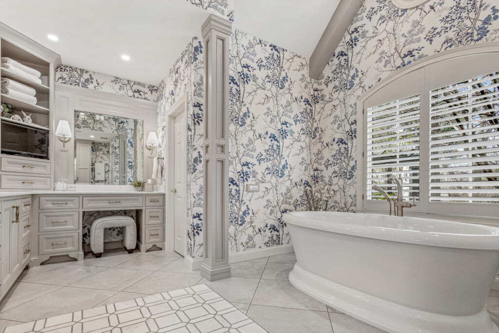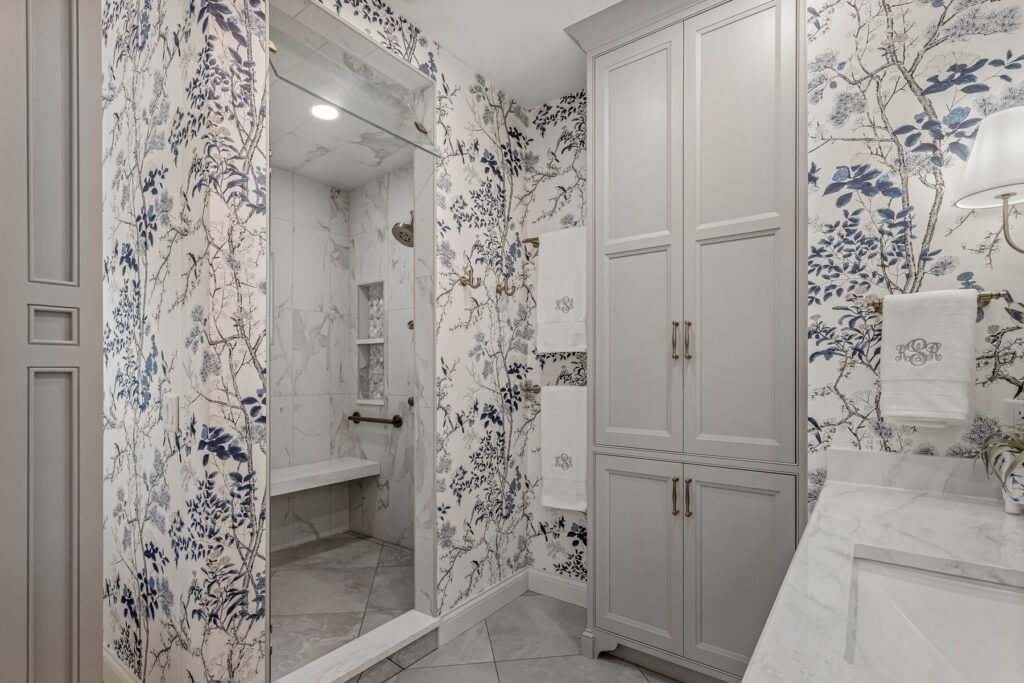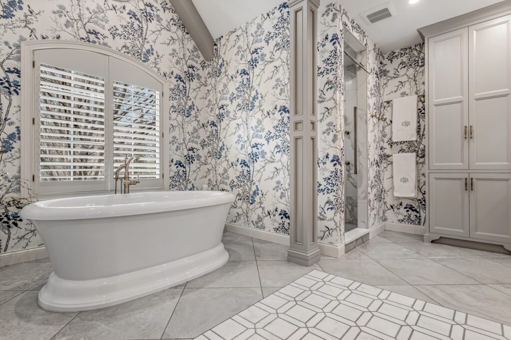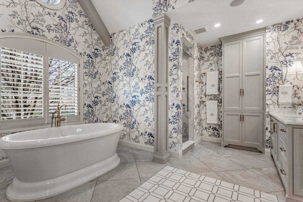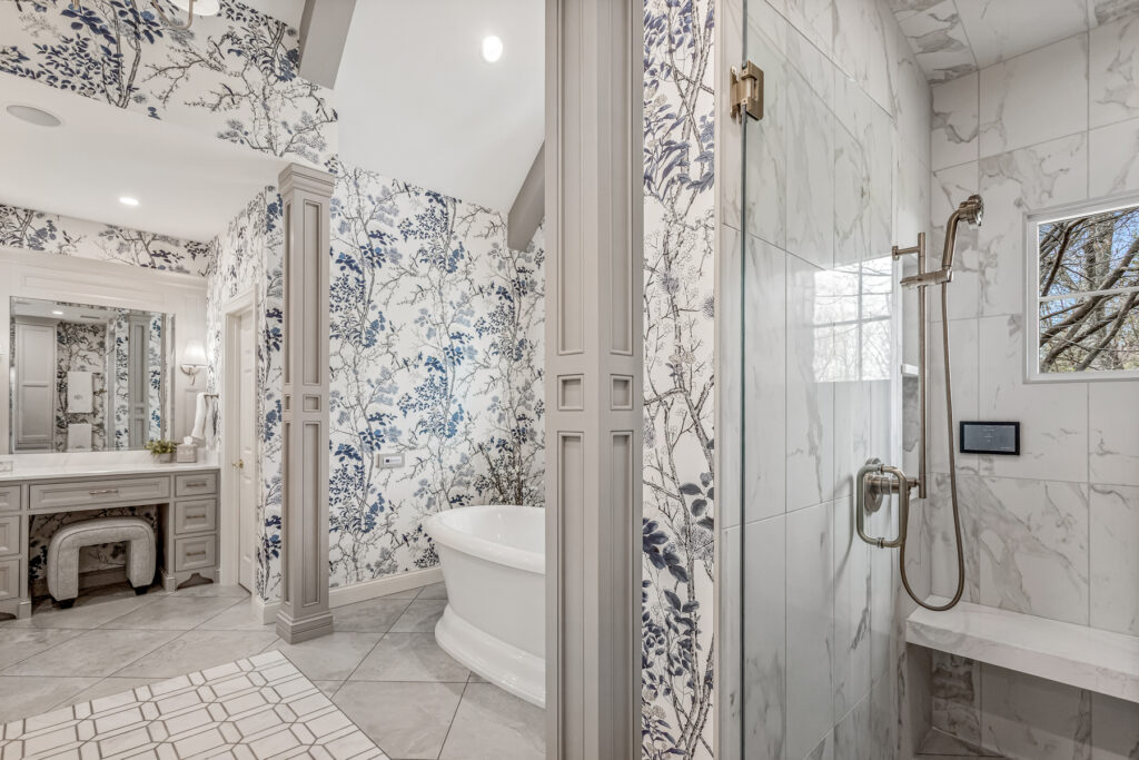 One of the most striking design element is the wallpaper—a delicate blue-and-white botanical pattern. It wraps the entire space, transforming the room into an immersive, garden-like environment. The cool blue tones contrast gently with the crisp white trim and soft gold fixtures, keeping the space fresh rather than busy.
