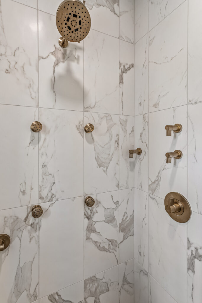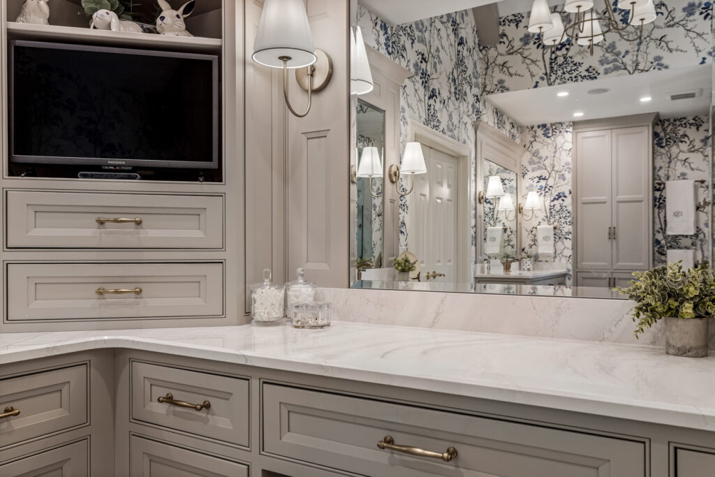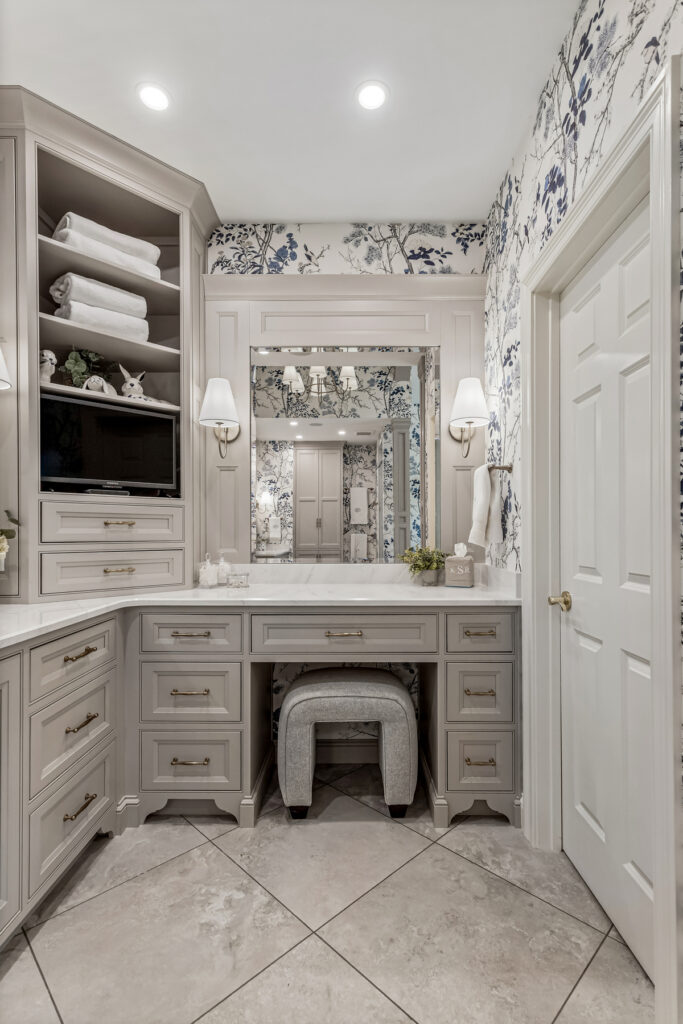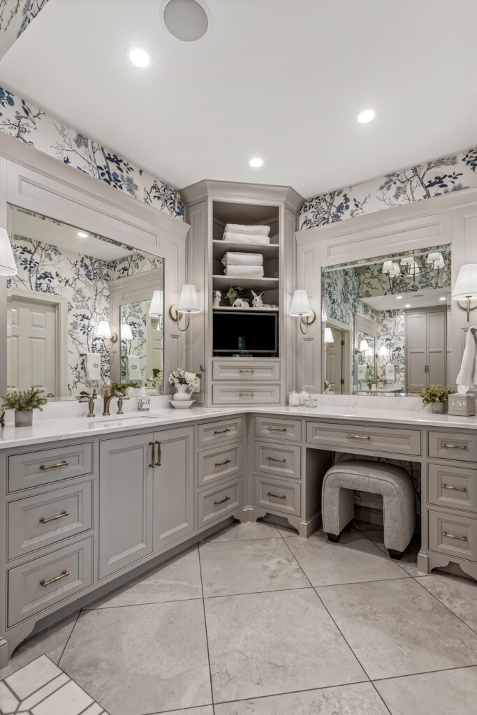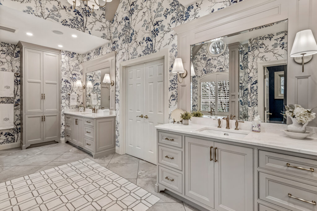 This bathroom project centers on symmetry, softness, and a refined, almost storybook elegance. It leans towards a transitional style, blending classic elegance with clean, modern restraint. We kept a similar layout to the original, which worked well for the homeowners, but updated storage options with the cabinetry, high end finishes and custom architectural details.