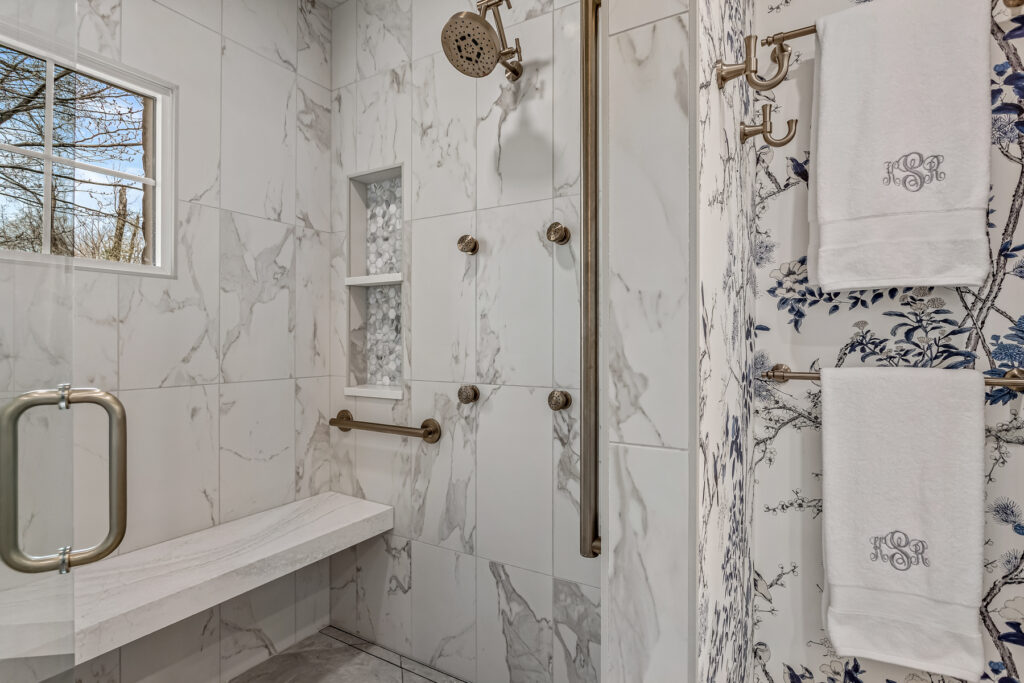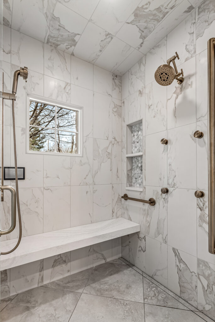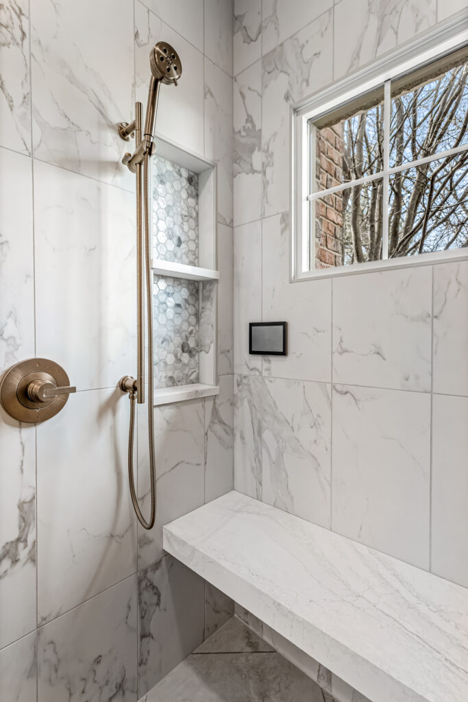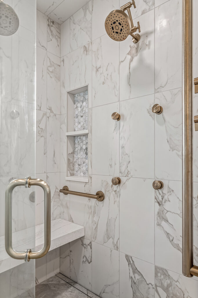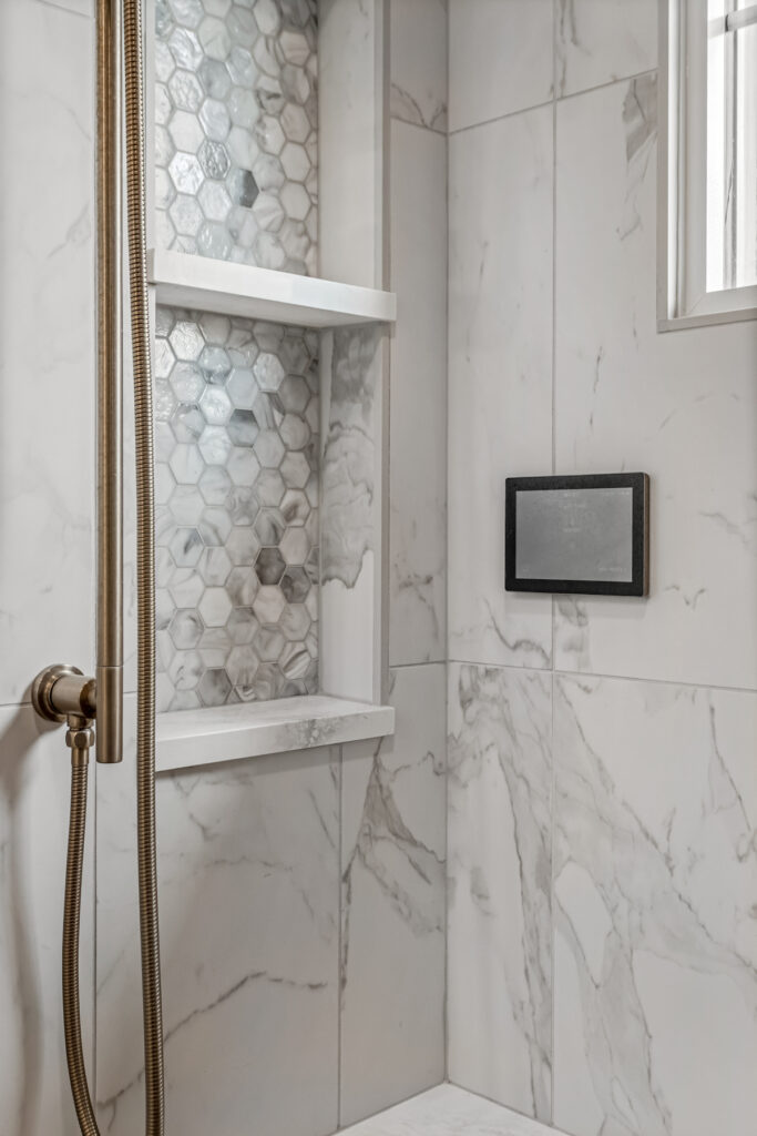 Shower tile - Vallelunga Calacatta VI with Oceanside Las Playas glass tile detail in shower niche