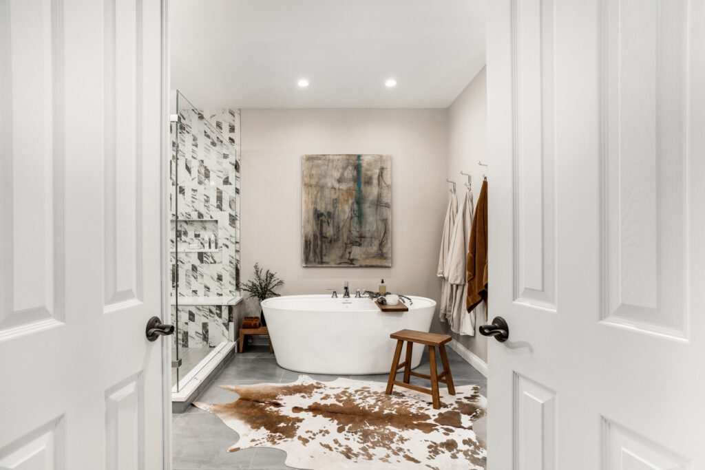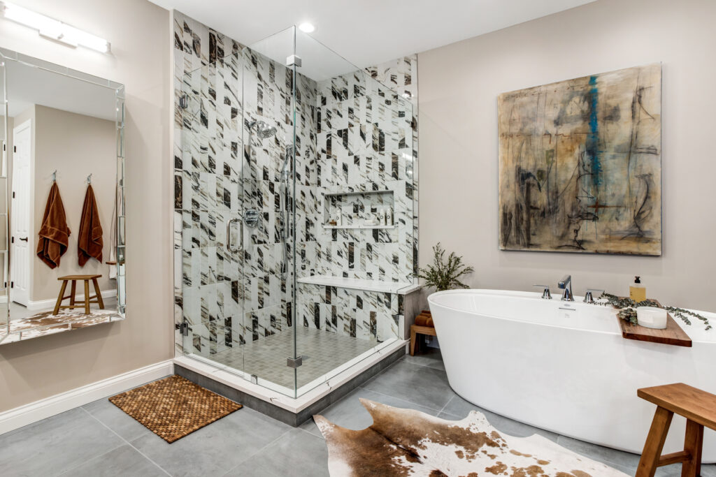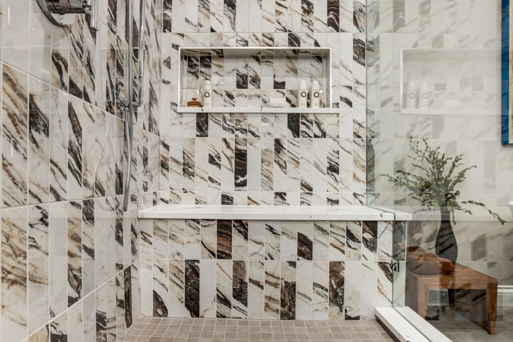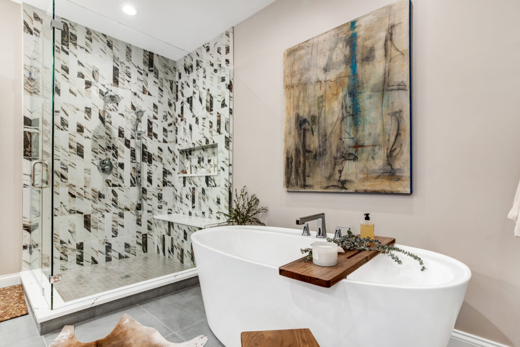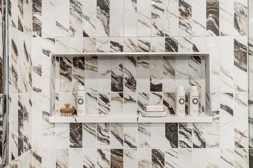 I love the bold choice for the shower wall tile. It shows so much personality. The homeowners decorating touches really elevated her choices and it exudes a calm and stylish place to rest.