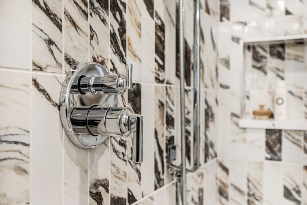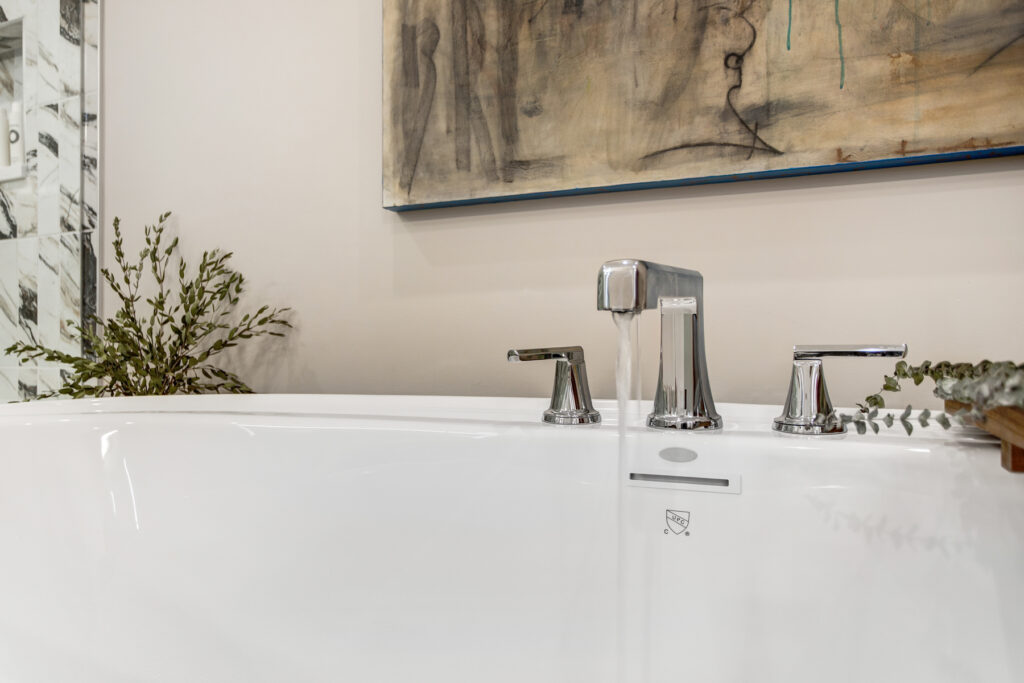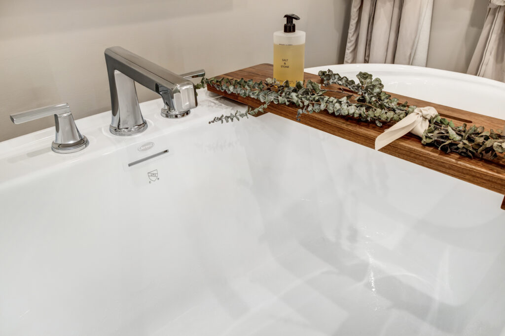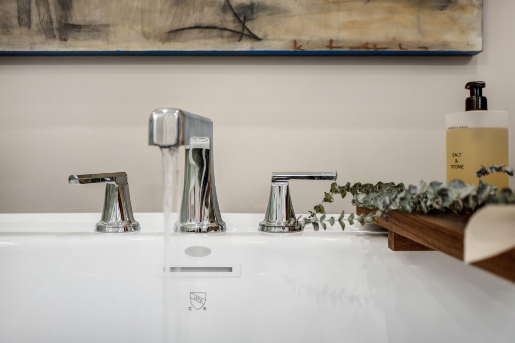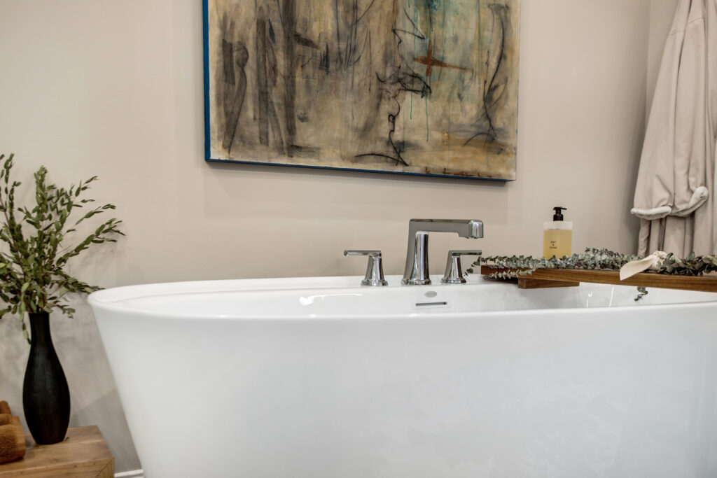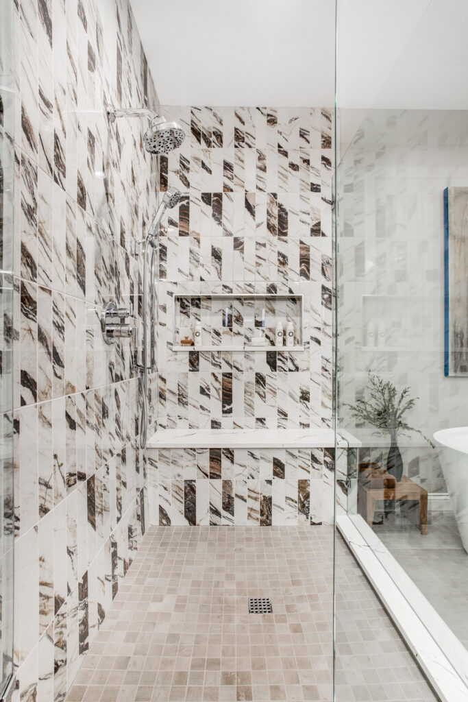 I love the bold choice for the shower wall tile. It shows so much personality. The homeowners decorating touches really elevated her choices and it exudes a calm and stylish place to rest.