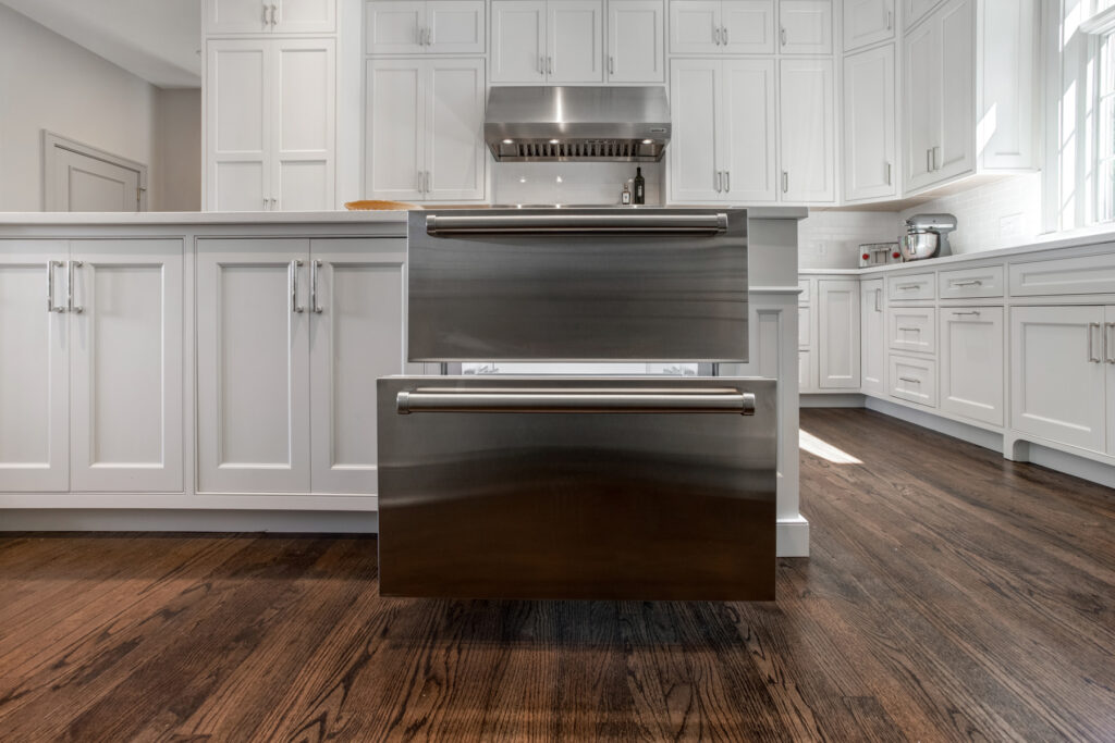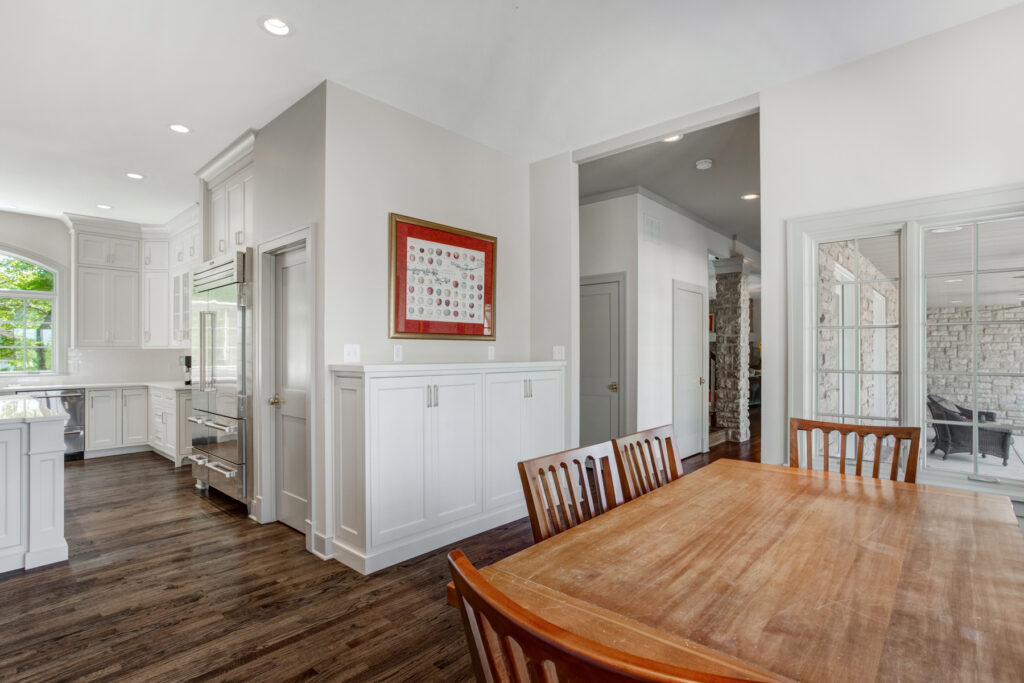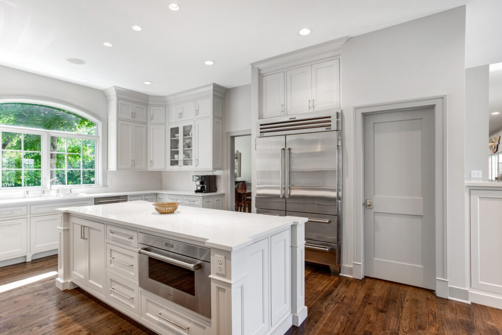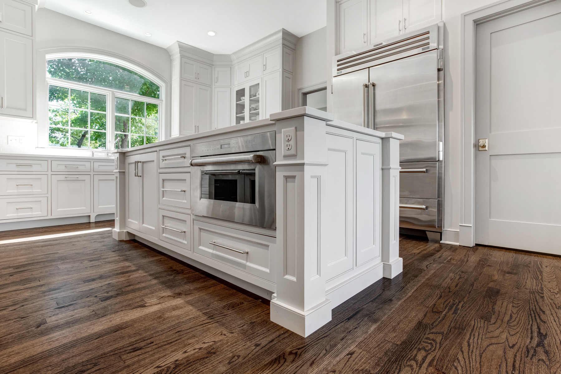 This kitchen exudes timeless elegance with its neutral cabinetry, expansive storage, and rich hardwood flooring that adds warmth and balance. A grand arched window floods the space with natural light, highlighting the clean lines and refined detailing throughout. Professional-grade appliances and a central island anchor the design, blending function with sophistication. The result is a bright, welcoming kitchen that feels both classic and contemporary—perfect for cooking, gathering, and entertaining.